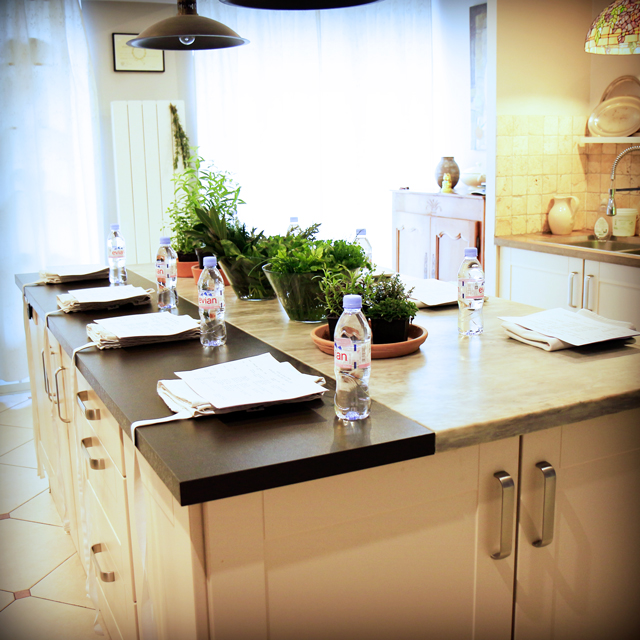 Getting ready to have a little glass of bubbly before continuing class, accompanied by a little "saladier Lyonnaise", which has very little to do with salad and much to do with the joy of a communal table.